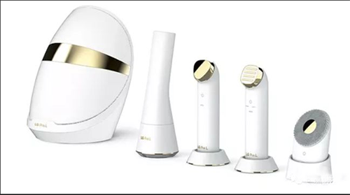 LG Pra的珍珠色裝置,左旋發(fā)光二極管護(hù)膚套裝與金色的略微閃亮的鑲嵌件協(xié)調(diào)一致,用于制造該裝置的硅樹脂和金屬也應(yīng)用于醫(yī)療領(lǐng)域。